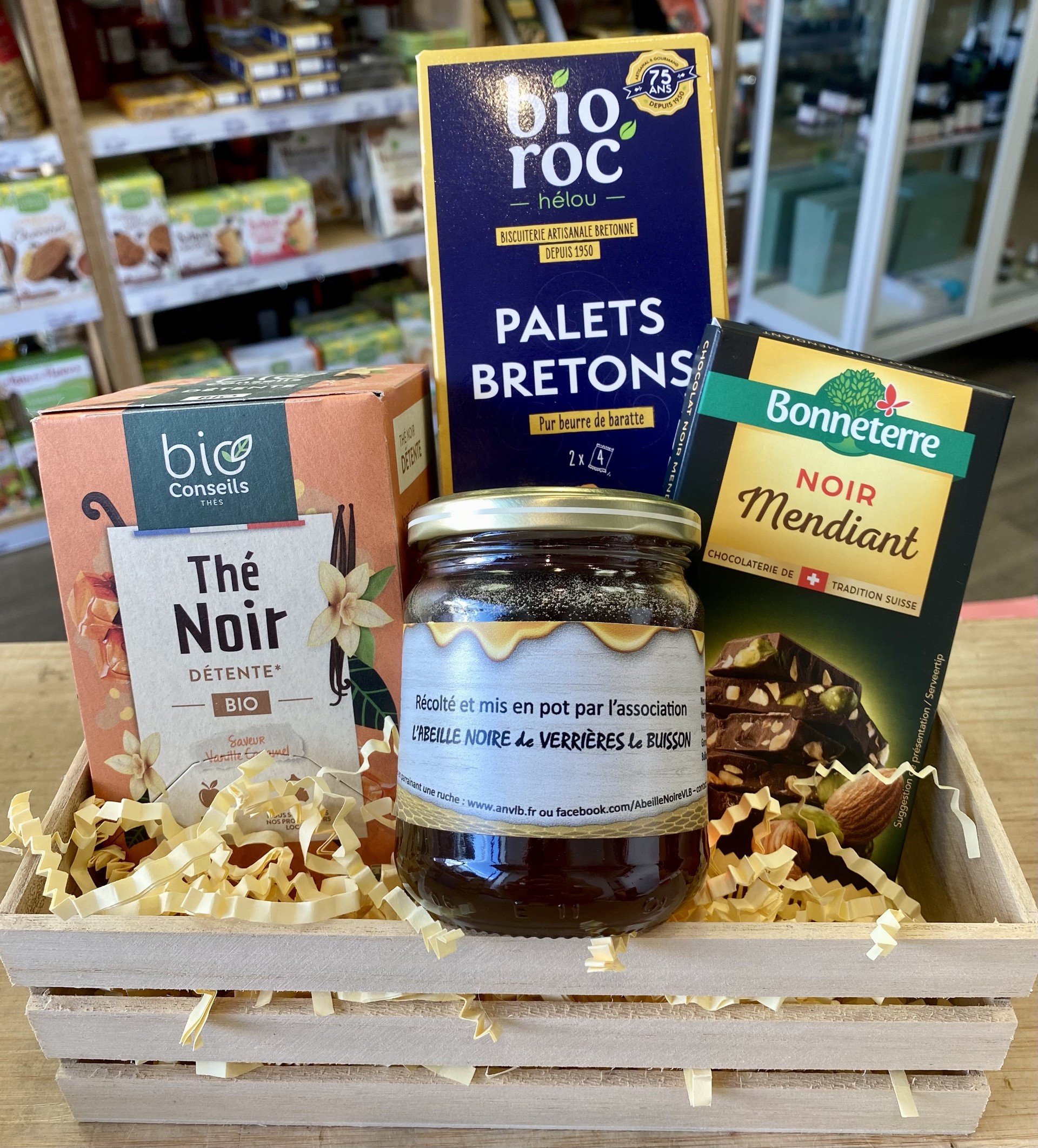 Un panier gourmand avec du Miel de Verrières à retirer en magasin (avec le bon TUVB) 23 rue de Paron.